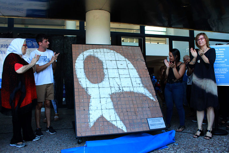 Ante un auditorio repleto compuesto en su mayoría por jóvenes ingresantes a la carrera de periodismo, la presidenta de Madres entregó uno de los 32 símbolos que estaban estampados sobre las baldosas de alrededor de la pirámide de Mayo, que el gobierno de la Ciudad de Buenos Aires removió de la plaza histórica el 22 de enero pasado.