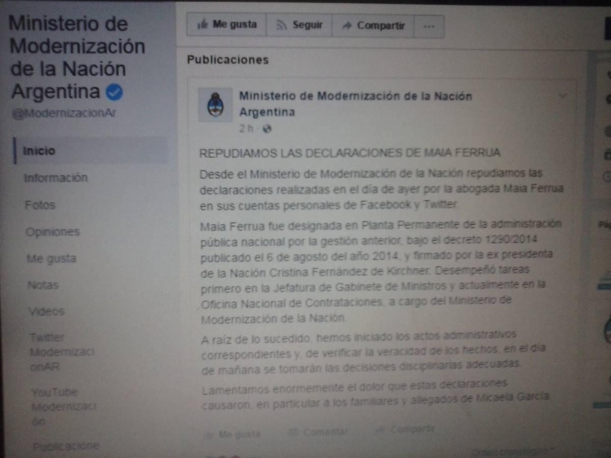 REPUDIAMOS LAS DECLARACIONES DE MAIA FERRUA. Desde el Ministerio de Modernización de la Nación repudiamos las declaraciones realizadas en el día de ayer por la abogada Maia Ferrua en sus cuentas personales de Facebook y Twitter. Maia Ferrua fue designada en Planta Permanente de la administración pública nacional por la gestión anterior, bajo el decreto 1290/2014 publicado el 6 de agosto del año 2014, y firmado por la ex presidenta de la Nación Cristina Fernández de Kirchner. Desempeñó tareas primero en la Jefatura de Gabinete de Ministros y actualmente en la Oficina Nacional de Contrataciones, a cargo del Ministerio de Modernización de la Nación. A raíz de lo sucedido, hemos iniciado los actos administrativos correspondientes y, de verificar la veracidad de los hechos, en el día de mañana se tomarán las decisiones disciplinarias adecuadas. Lamentamos enormemente el dolor que estas declaraciones causaron, en particular a los familiares y allegados de Micaela García.