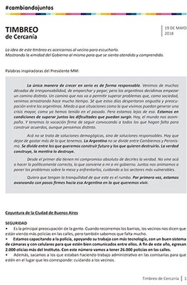En esa aparición, y en la rueda de prensa, el aparato de comunicación presidencial puso a prueba un discurso que se reproduce en los instructivos para timbreadores de este sábado. Para cada provincia el material tiene un decálogo de respuestas específicas sobre seguridad, casa propia para la clase media, cortes y piquetes, metas de inflación, aumento de tarifas y las principales preocupaciones que arrojen las encuestas.