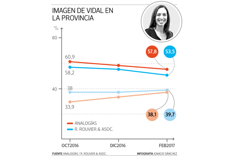 Otra encuesta de Analogías, también realizada en febrero, le da una imagen positiva de 57,8% contra los 60,9% de diciembre. La consultora marca que existe un deterioro respecto de 2016, ubicándose por primera vez por debajo de los 60 puntos de valoración positiva. El sondeo muestra también que la imagen negativa creció cuatro puntos.