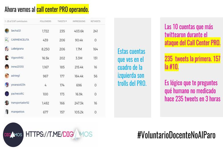 El canal de la red social Telgram, Digamos, difundió un informe que demuestra como el HashTag (HT) #VoluntarioDocenteNoAlParo se convirtió en Trending Topic (TT) por el trabajo del call center PRO.