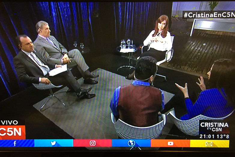 CFK realizó una entrevista para C5N ante Roberto Navarro, Víctor Hugo Morales, Gustavo Sylvestre y Daniela Ballester. Fue en el Instituto Patria, donde la ex mandataria llegó a las 20:30 con una bandera argentina en la mano y a la voz de Feliz día de la Patria, frente a un nutrido grupo que la esperaba en la calle Rodríguez Peña, horas después de que en la ciudad (también en la provincia de Buenos Aires) se viera gran cantidad de carteles con la imagen de Cristina y la leyenda el sol del 25 viene asomando, lo que se prestaba para especular sobre su posible candidatura.